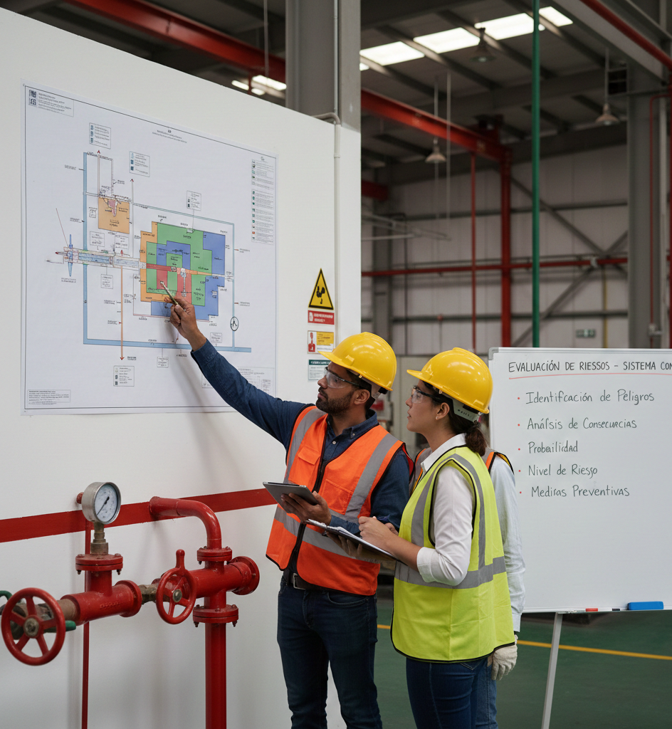 Revisar las normativas locales e internacionales aplicables (por ejemplo, NFPA, FM, ISO).Asegurarse de que el diseño cumpla con los códigos de construcción y seguridad contra incendios.